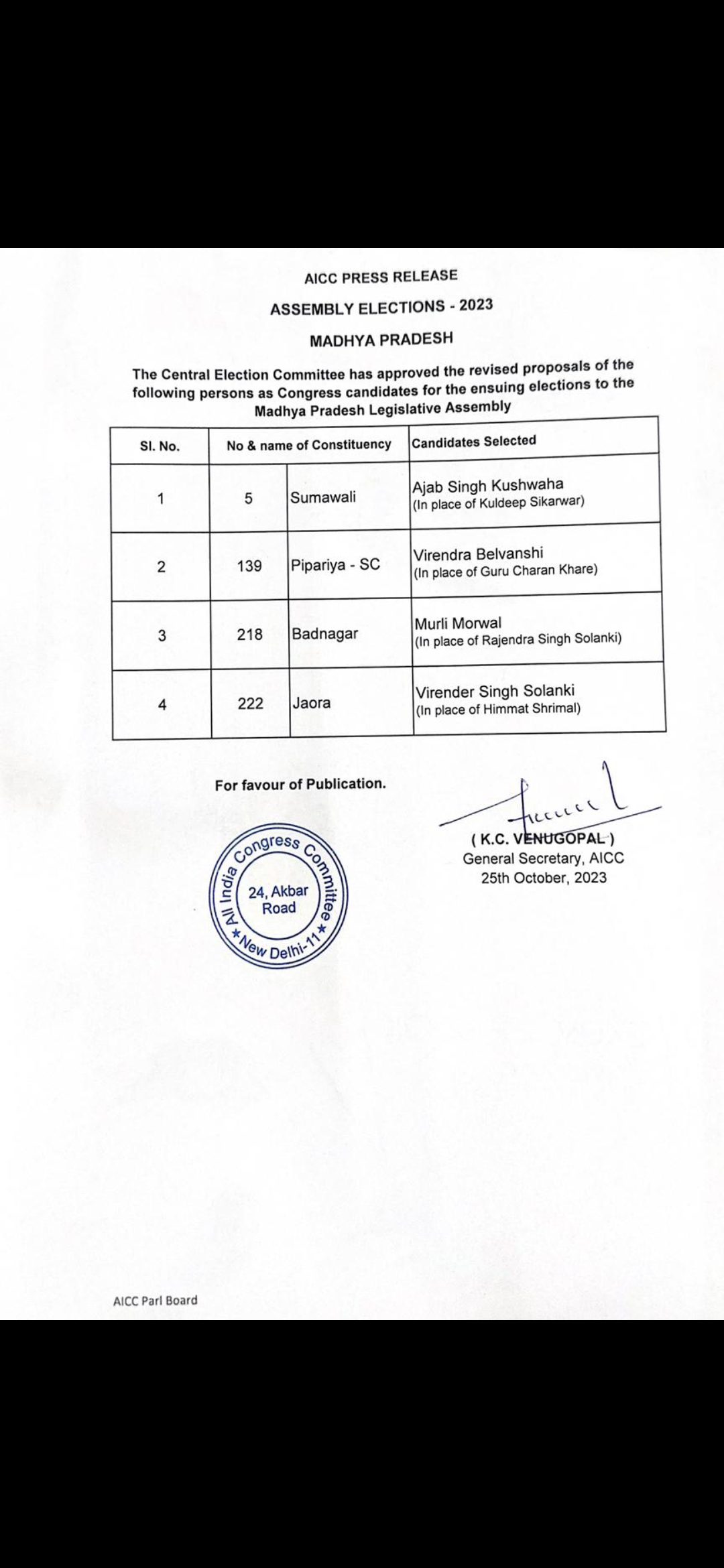 कांग्रेस ने सुमावली (मुरैना) में कुलदीप सिकरवार की जगह अजब सिंह कुशवाहा, पिपरिया (नर्मदापुरम) में गुरुचरण खरे की जगह वीरेंद्र बेलवंशी, बड़नगर (उज्जैन) में राजेंद्र सिंह सोलंकी की जगह मुरली मोरवाल और जावरा (रतलाम) में हिम्मत श्रीमाल की जगह वीरेंद्र सिंह सोलंकी को उम्मीदवार बनाया है। इससे पहले दूसरी सूची में कांग्रेस ने 3 प्रत्याशी (गोटेगांव, दतिया, पिछोर) बदले थे। इस तरह से कांग्रेस 7 प्रत्याशी बदल चुकी है
