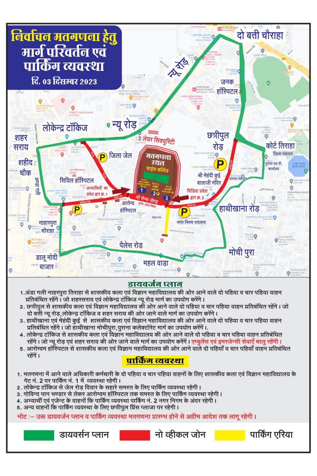 मतगणना ड्यूटी में लगे शासकीय अधिकारियों एवं कर्मचारियों तथा विधानसभा चुनाव के प्रत्याशियों एवं उनके प्रतिनिधियों व आम नागरिको से अपील है कि उपरोक्तानुसार मतगणना दिनांक 03 दिसंबर 2023 को यातायात पुलिस रतलाम द्वारा की गई पार्किंग व्यवस्था तथा यातायात डायवर्शन व्यवस्था मे आवश्यक सहयोग करे।