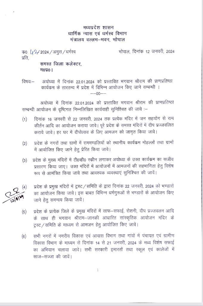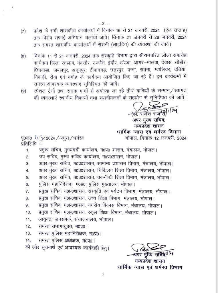 जगमगाएगा मध्य प्रदेश सरकार ने किया आदेश जारी – : प्राण प्रतिष्ठा समारोह को लेकर सरकार ने मध्य प्रदेश में धूम मचाने और सम्पूर्ण प्रदेश को जगमगाने की तैयारी तेज कर ली है और प्रदेश के समस्त कलेक्टर और अन्य अधिकारीयों को आदेश जारी करके आदेश का पालन सुनिश्चित करने का कहा है