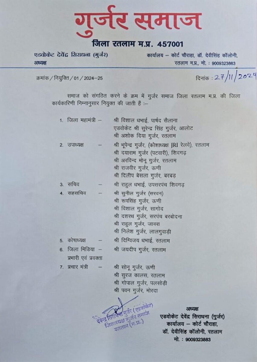 रतलाम। गुर्जर समाज जिला रतलाम (म.प्र.) द्वारा समाज को संगठित करने के उद्देश्य से नई जिला कार्यकारिणी का गठन किया गया है। इस कार्यकारिणी में जिलाध्यक्ष देवेंद्र सिराधना (गुर्जर) ने विभिन्न पदों पर जिम्मेदारी सौंपी है