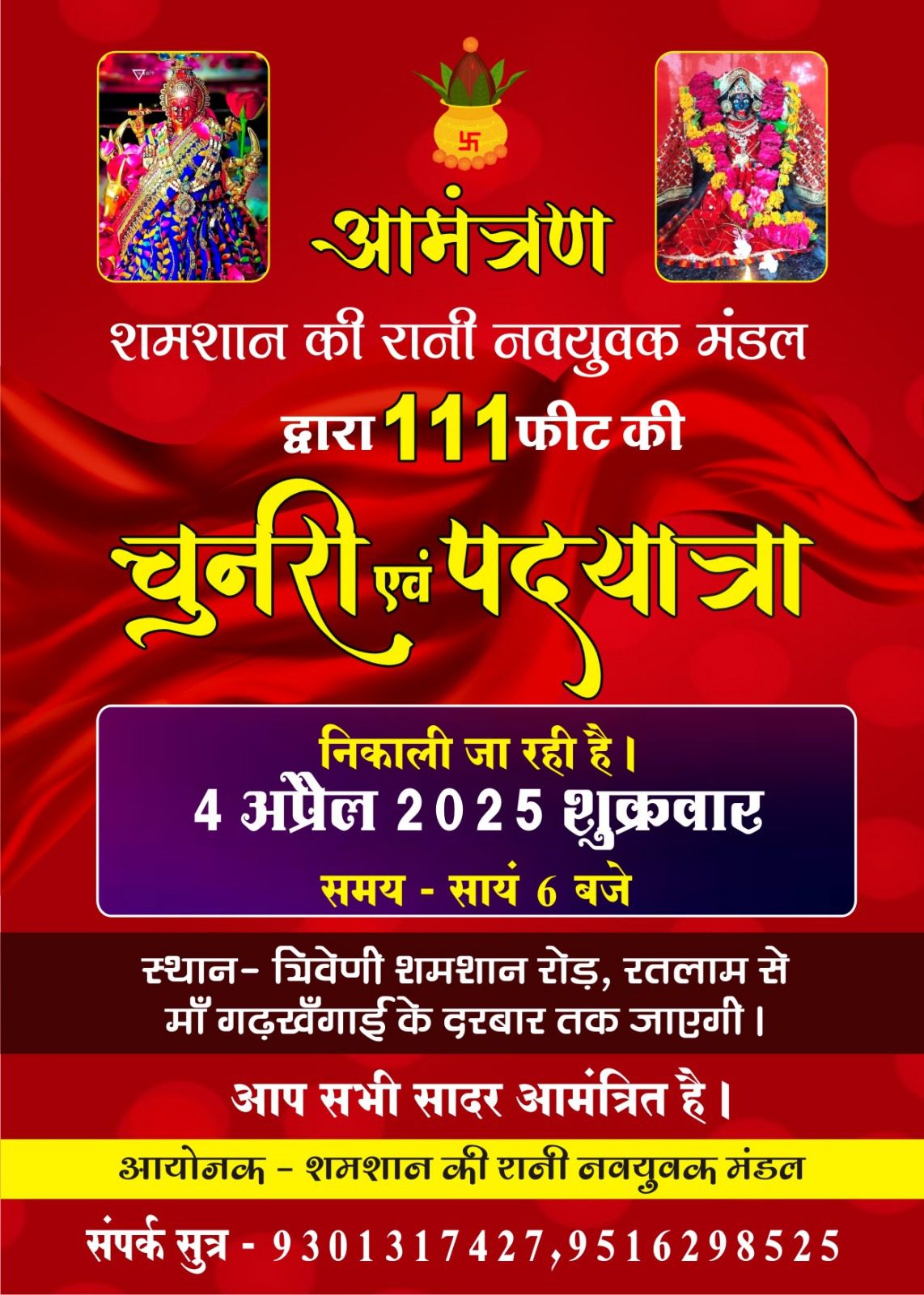 रतलाम – : नगर के शमशान रोड स्थित शमशान की महारानी मंदिर से गढ़ खंगाई माता जी तक पैदल चुनरी यात्रा निकाली जायेगी जिसमे ढोल नगाड़े बैंड से त्रिपोलिया गेट, चांदनी चौक, बाजना बस स्टैंड से होकर अष्टमी को प्रात: राजापुरा माताजी पहुंचेगी।
