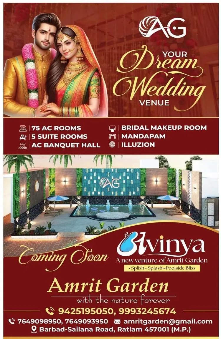 रतलाम के अमृत गार्डन में मेट्रो सिटी की शादी का अहसास अब आपको मिलेगा। अमृत गार्डन शरू से अपने ग्राहकों की सुविधाओं एवं कम खर्च को ध्यान में रख हर साल एक नई सोच के साथ आगे बढ़ रहा है। इस बार सभी सुविधा से सुसज्जित इल्लूजन साउंड प्रूफ डीजे हॉल की विशेष सौगात देने जा रहा है। इस हॉल में डीजे जॉकी के साथ डिस्क लाइटिंग, लेजर लाइट्स साउंड, स्मोक मशीन के द्वारा शादी के डांस प्रोग्राम में आप मेट्रो सिटी का अहसास शादी में आए अतिथियों को करा सकेंगे।