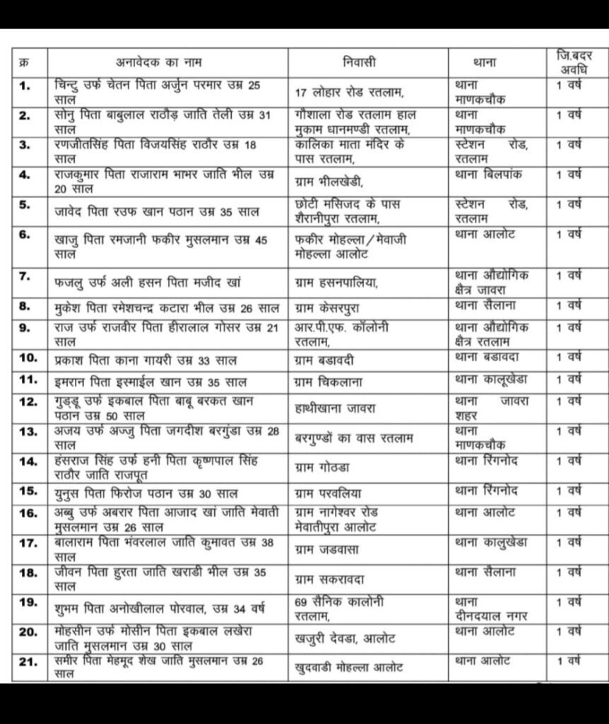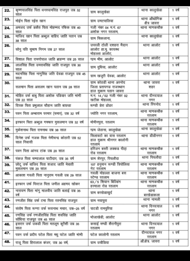 अपराधो को अपना मानने वाले ऐसे 48 अपराधियों पर अब कलेक्टर सूर्यवंशी और एसपी तिवारी की कार्यवाही बुलंद हो चुकी है … एसपी के प्रतिवेदन पर अब कलेक्टर भी तत्काल एक्शन लेने के मुड़ में आ गए है इसी तर्ज पर रतलाम नगर से 18 अपराधियों को और 30 अपराधियों को जिलाबदर किया गया है ।