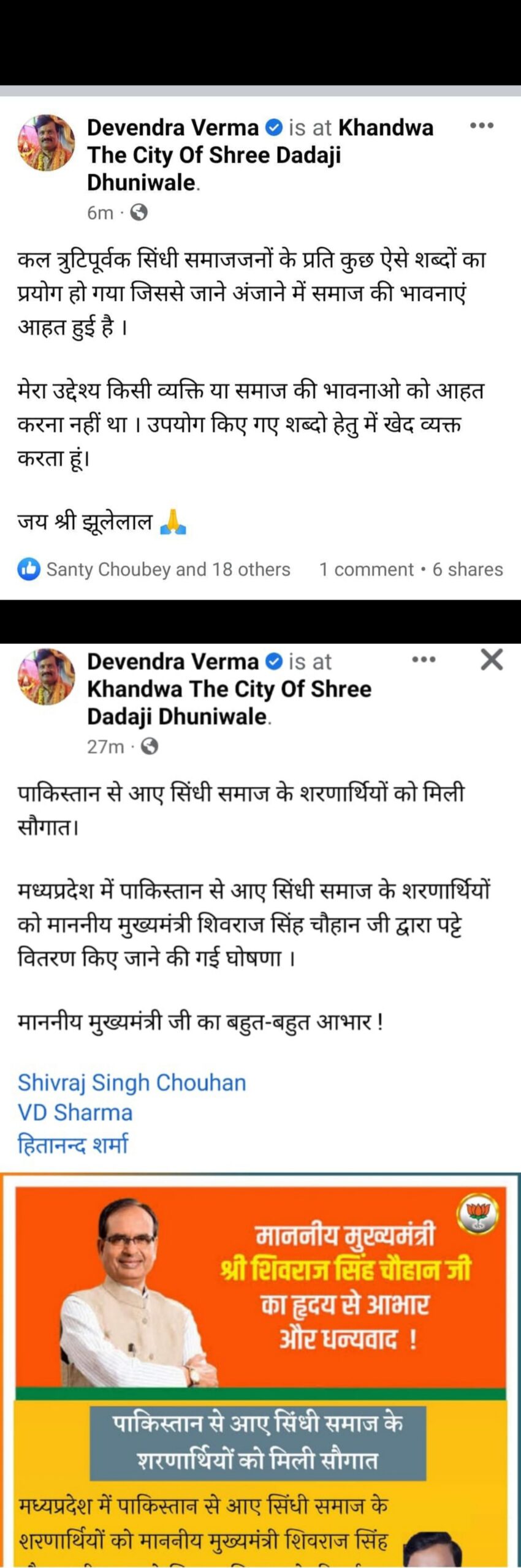 आज बात की गरमाए हुए मामले की तो वह मध्य प्रदेश के खंडवा का है जहा के विधायक देवेंद्र वर्मा के द्वारा सोशल मीडिया पर अपलोड की गई पोस्ट से सिंधी समाज में बवाल खड़ा हो गया और विधायक को सद्बुद्धि देने के लिए भगवान झूलेलाल जी से विनती की गई और ज्ञापन सोपा गया है …बताया जाता है की सिंधी समाज इसलिए आक्रोशित हो उठा क्योंकि एक अपलोड की गई पोस्ट में विधायक द्वारा सिंधी समाज को पाकिस्तान से आए हुए शरणार्थी बताया गया जिससे सिंधी समाज आक्रोशित हुआ है बताया जाता है की खंडवा विधायक देवेंद्र वर्मा द्वारा अपलोड की गई पोस्ट में शासन की पट्टा योजना को सिंधी समाज से जोड़ना विधायक को भारी पड़ा है और समाज का आक्रोश झेलना पड़ा है